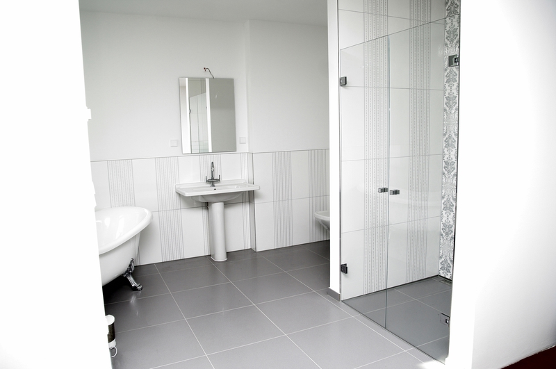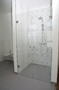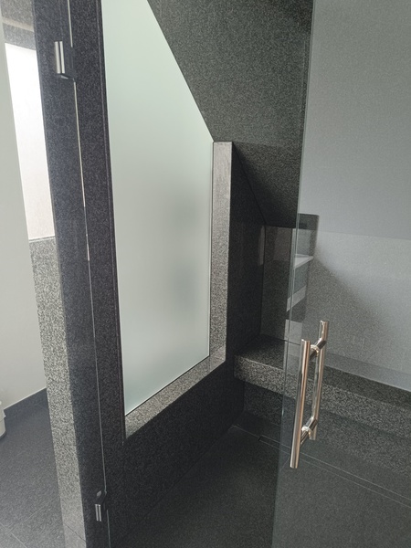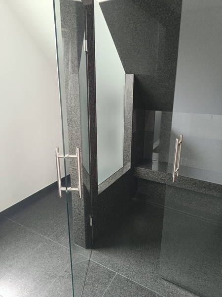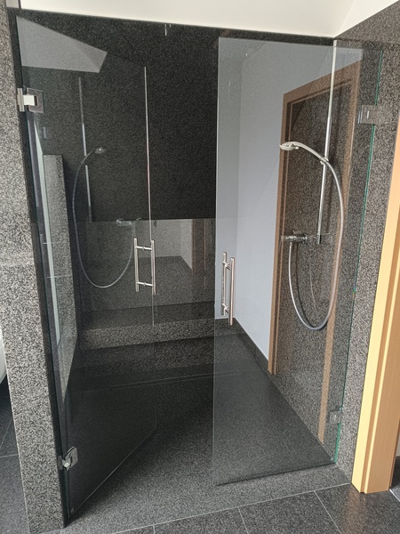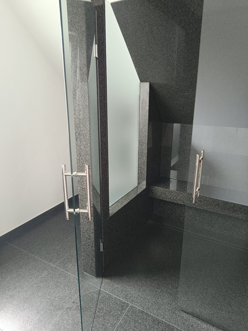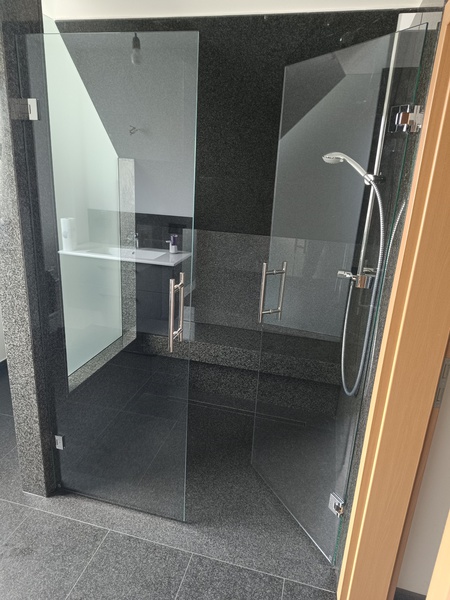 Zusammen mit unserem Naturstein-Partnerbetrieb bauen wir bodenebene Granitduschen mit pflegeleichten Ganzglastüren.